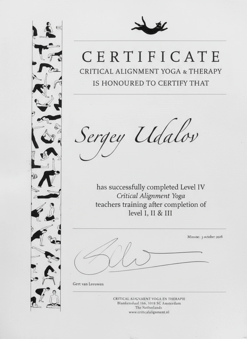 - Дипломированный преподаватель хатха йоги и йоги точечного выравнивания (Critical Alignment)
