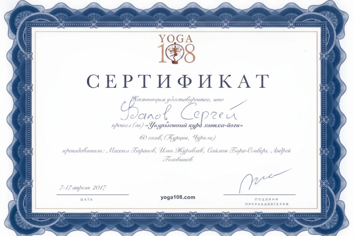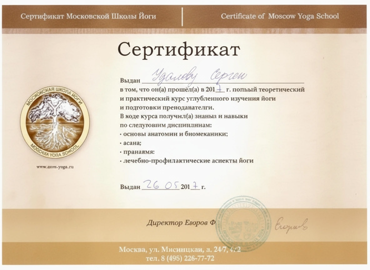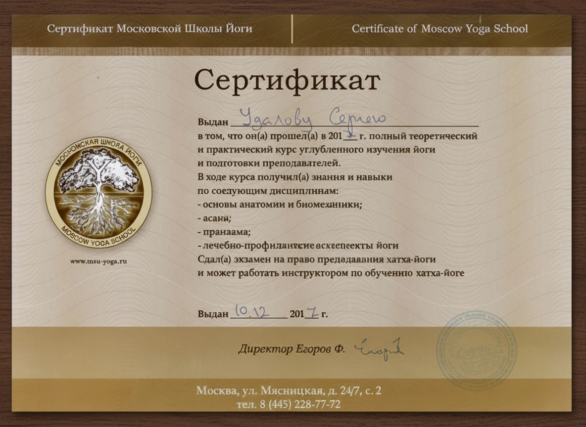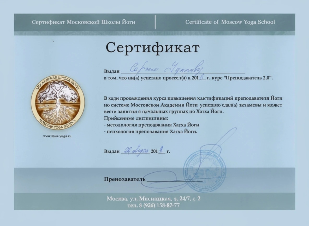 | Сертификация | Дипломированный преподаватель хатха йоги и йоги точечного выравнивания |